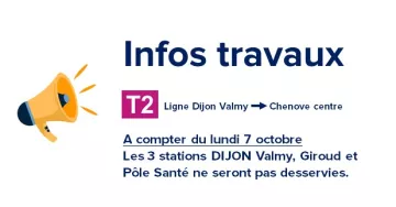 En raison de travaux à la station DIJON Valmy, dès le lundi 7 octobre la ligne T2 circulera uniquement entre les stations Chenôve Centre et Zénith, jusqu'à fin décembre.